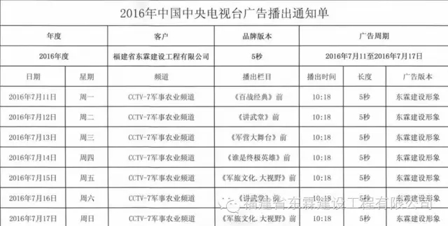 福建东霖建设工程集团于2016年7月份在中国中央电视台投放