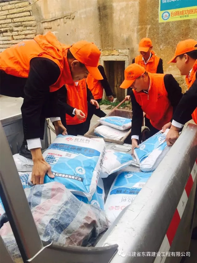 福建东霖建设工程集团的质安部陈贤龙、陈军军、赵福龙、经营部曾旭光、行政部曾子铭把车上腻子粉搬运到张大爷的新家里。