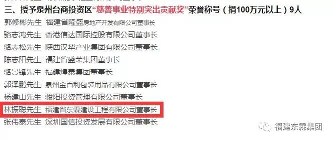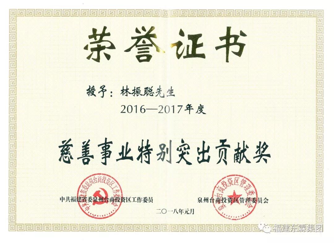 福建东霖建设工程集团林振聪董事长荣获2016-2017年度“慈善事业特别突出贡献奖”荣誉。