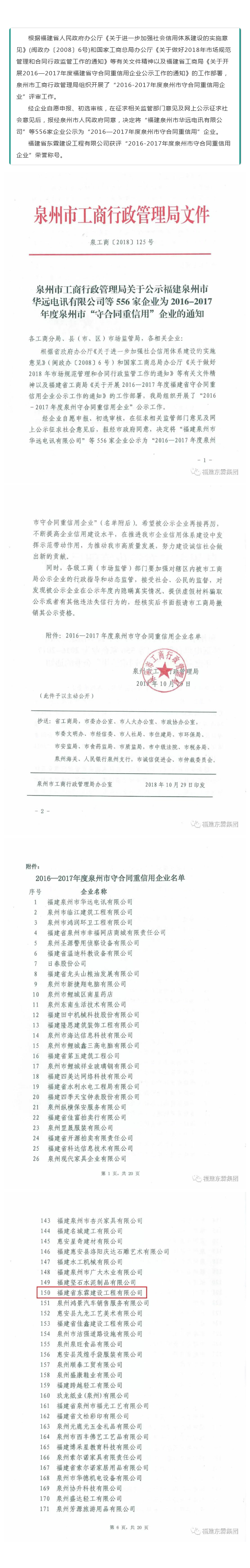 东霖企业获评2016-2017年度泉州市“守合同重信用